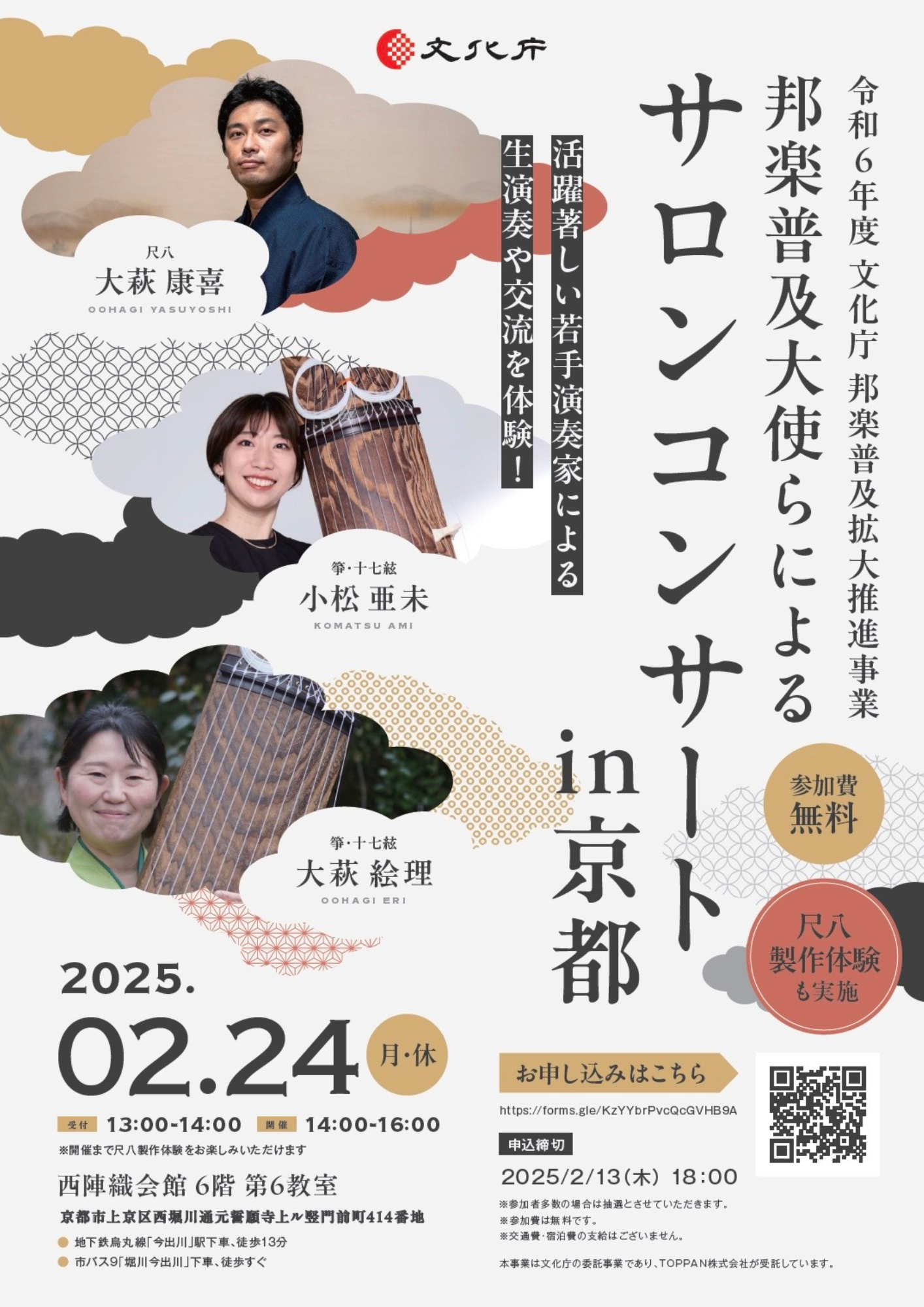 令和6年度 文化庁 邦楽普及拡大推進事業として開催される、若手実力派演奏家によるサロンコンサートです。お箏(琴)と尺八の演奏鑑賞のほか、尺八の製作体験や、交流タイムをお楽しみいただけます。