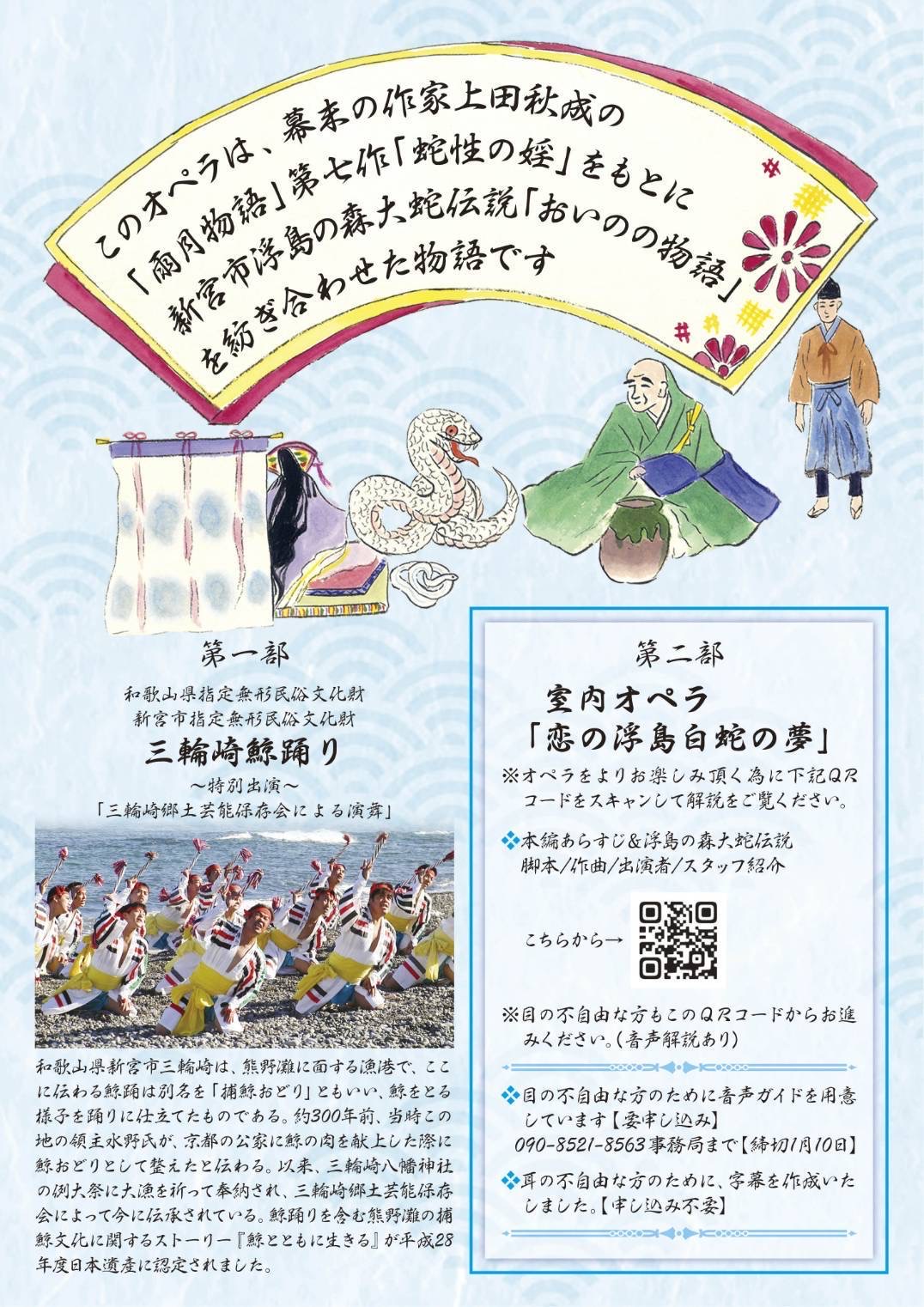 2023年度の和歌山県文化奨励賞にも選ばれた、『紀州の民話をオペラに』事業の第九弾!幕末の作家・上田秋成『雨月物語』第七作「蛇性の婬」をもとに、新宮市浮島の森や蛇伝説「おいのの物語」を紡ぎ合わせた物語。