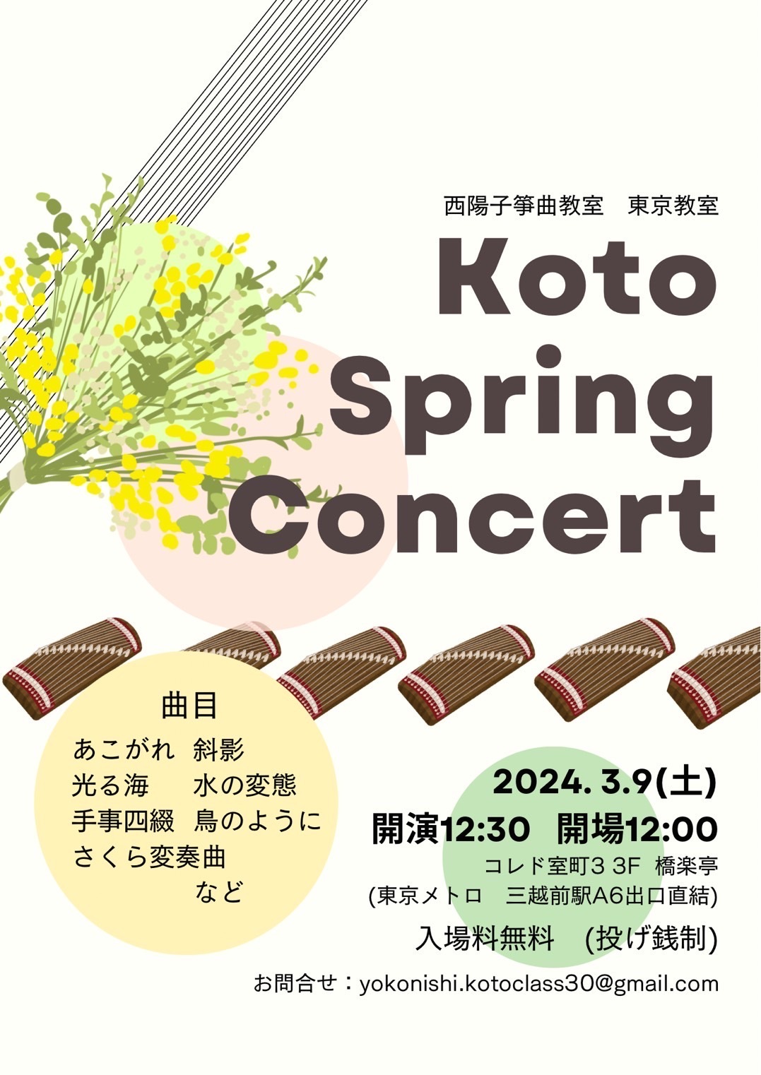 西陽子箏曲教室 Spring Concert 2024 出演情報 2024.02.17 日時:2024年3月9日(日) 開場 12:00 / 開演 12:30場所:コレド室町3 3階 橋楽亭入場料:無料(投げ銭制)