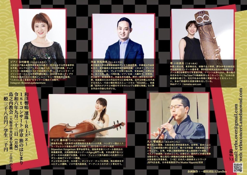 2024/9/23(月祝) 和洋共鳴アンサンブル『凛珠(リズ)』1stコンサート 出演情報 2024.07.132024.08.26 日時:2024年9月23日(月祝)場所:島之内教会(大阪府中央区東心斎橋1-6-7)入場料:一般 3,800円 / 学生 2,000円