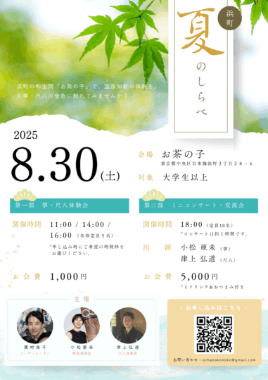 出演情報 出演情報浜町 夏のしらべ浜町の和空間『お茶の子』で、温故知新の体験を。お箏・尺八の音色に触れてみませんか?日時:2025年 8月 30日(土)第一部(体験会):11:00 / 14:00 / 16:00第二部(コンサート):18:...